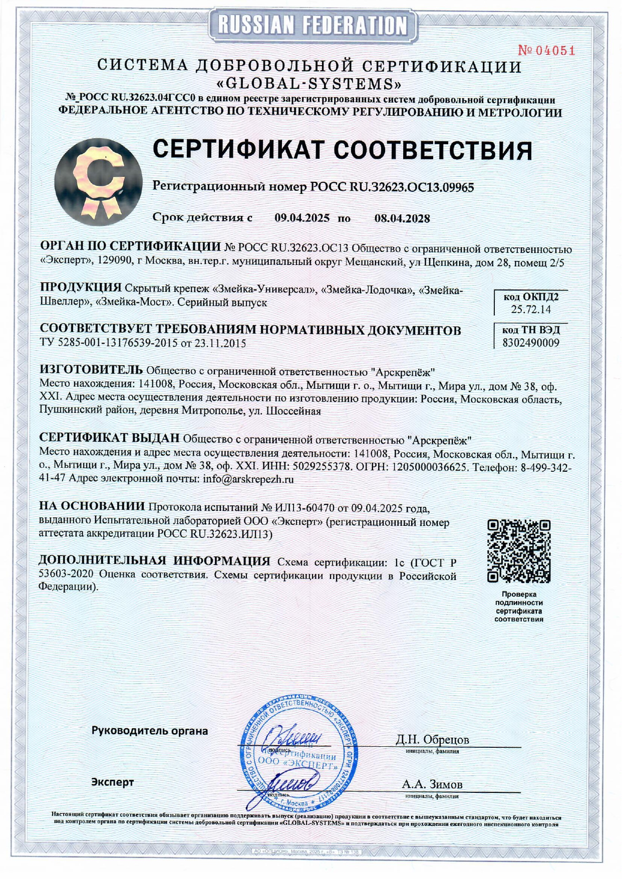Скрытый крепеж системы "Змейка" монтируется на доску с тыльной стороны и его не видно на поверхности. Модель при помощи саморезов крепится на доску с тыла таким образом, чтобы края крепежа выступали за край доски. Свободный край крепежа заводится под уже смонтированную доску, и доска плотно задвигается до стопора предыдущей доски. В отверстие у стопора текущей доски закручивается саморез в лагу.